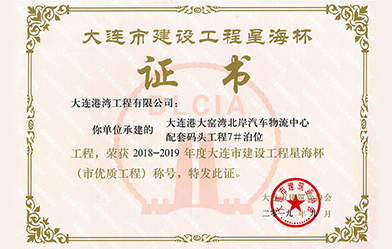 大連市建設(shè)工程星海杯你單位承建的大連港大窯灣北岸汽車物流中心配套碼頭工程7#泊位工程,榮獲2018-2019年度大連市建設(shè)工程星海杯稱號(hào)。