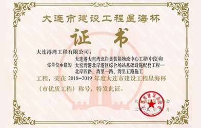 大連市建設(shè)工程星海杯你單位承建的大連港大窯灣北岸集裝箱物流中心工程(中段)和大窯灣港北岸港區(qū)綜合場(chǎng)站基礎(chǔ)設(shè)施配套工程-北岸四路、灣里一路、灣里五路施工工程,榮獲2018-2019年度大連市建設(shè)工程星海杯稱號(hào)。